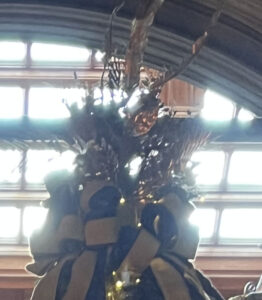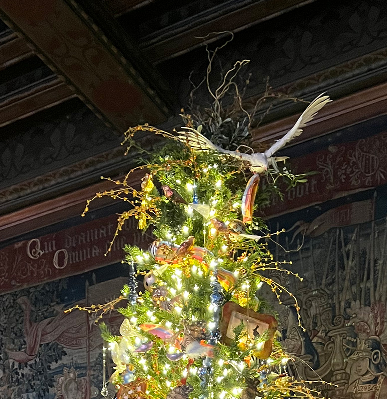 A pair of trees in the huge Tapestry Hall had models of Noah’s Ark beneath them and a variety of blown glass and porcelain ornaments in animal shapes. Pictures of animals interspersed the glittery glass and a very large stuffed or taxidermied white dove with wings spread created a focal p