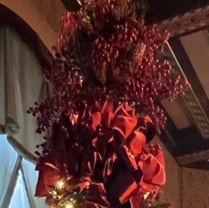 Mantels were draped in festive garlands that often included fresh or silk flowers. Pink and red roses were used lavishly. Of course, there were huge pots of poinsettias scattered throughout. A docent we asked said that many of the plants were live and real, from Biltmore’s own greenhouse and plant rooms, but admitted that some silk versions were also in use.