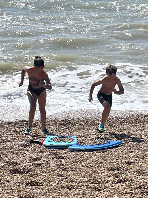 Day 9 (Tuesday): This would be our last full day in Hythe, but after the major outing the previous day, we all needed a lower key day. The children badly wanted to go swimming, so we met the family on the beach in the morning. They brought a blanket and swim gear.