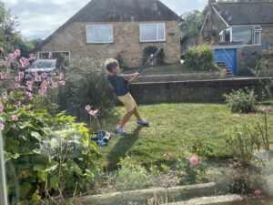 We gave James a new, metal baseball bat for his birthday and he immediately christened it by taking it out in the front garden and batting small balls which he’d improvised from tinfoil. The tinfoil was a good choice given that their front yard is small and his batted balls are landing close to neighbors’ cars and windows. He has a nice looking swing already, though.